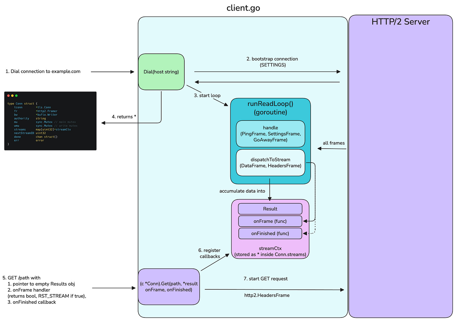 Tl;dr the Dial method bootstrap a connection to the target server, starts a Goroutine which handles all inbound frames. At first all frames shall have a streamIdentifier of 0x0, because we did not open a new stream yet, these are handled internally by the Goroutine.
